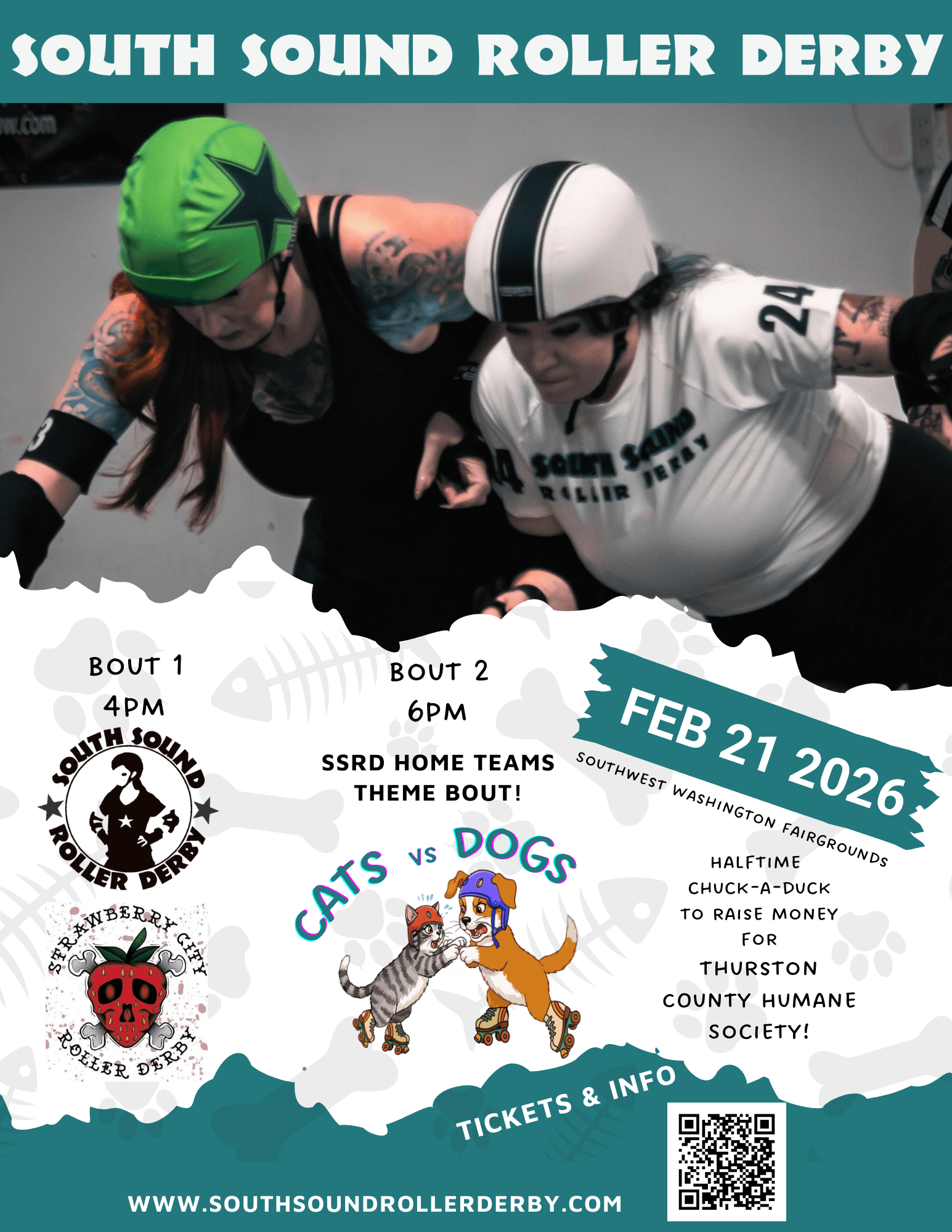 Join us for an exciting double header at the Southwest Washington Fairgrounds in Centralia on Saturday, Feb. 21! The first bout will feature South Sound taking on Strawberry City with a chuck-a-duck halftime show to raise money for the Thurston County Humane Society.
